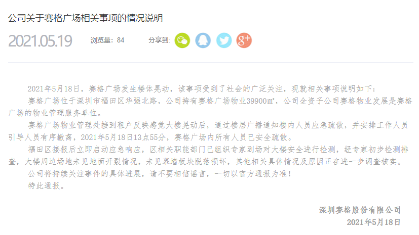 e公司讯,5月19日,深赛格(000058)最新发布《公司关于赛格广场相关事项的情况说明》。深赛格表示,公司持有赛格广场物业39900㎡,公司全资子公司赛格物业发展是赛格广场的物业管理服务单位。公司称,5月18日深圳福田相关职能部门已组织专家到场对大楼安全进行检测,经专家初步检测排查,大楼周边场地未见地面开裂情况,未见幕墙板块脱落损坏,其他相关具体情况及原因正在进一步调查核实,一切以官方通报为准。