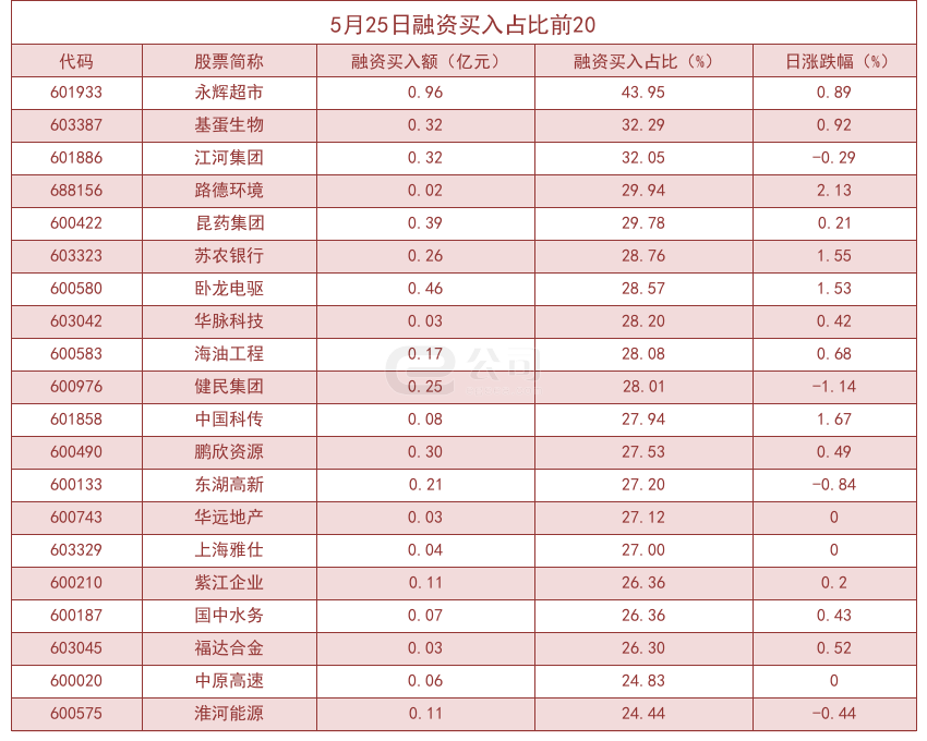 个股方面,沪深两市共有1066只个股有融资资金买入。从融资买入额占当日总成交金额比重来看,共有61只股票融资买入额占比超20%,其中永辉超市(43.95%)、基蛋生物(32.29%)、江河集团(32.05%)排名前三。