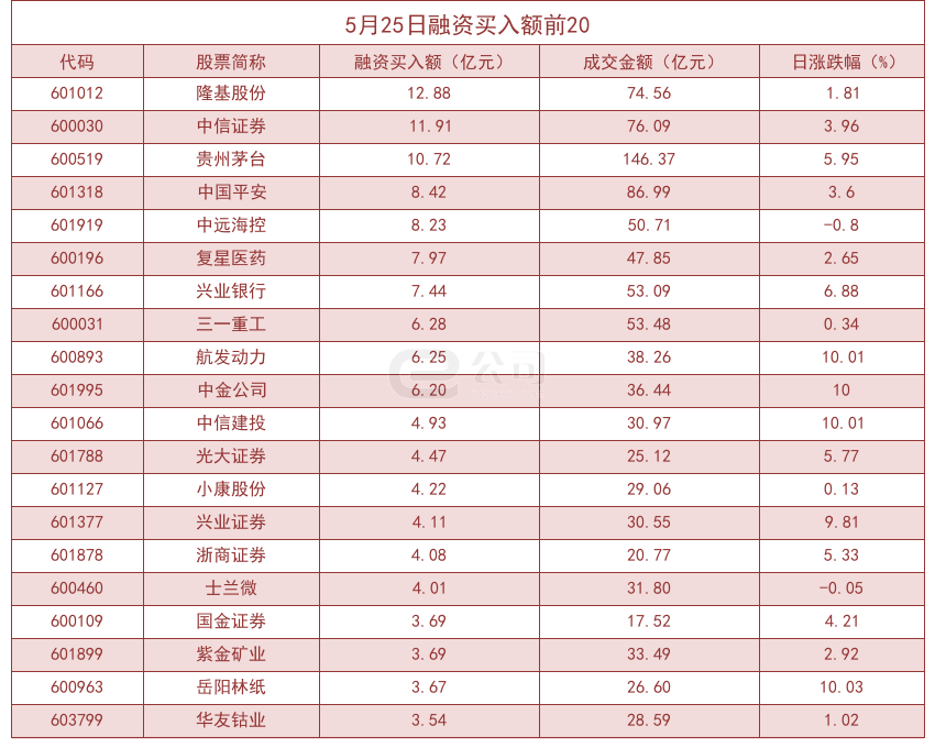 从融资资金买入金额来看,共有100只个股买入金额超亿元,其中隆基股份(12.88亿元)、中信证券(11.91亿元)、贵州茅台(10.72亿元)居前三位。
