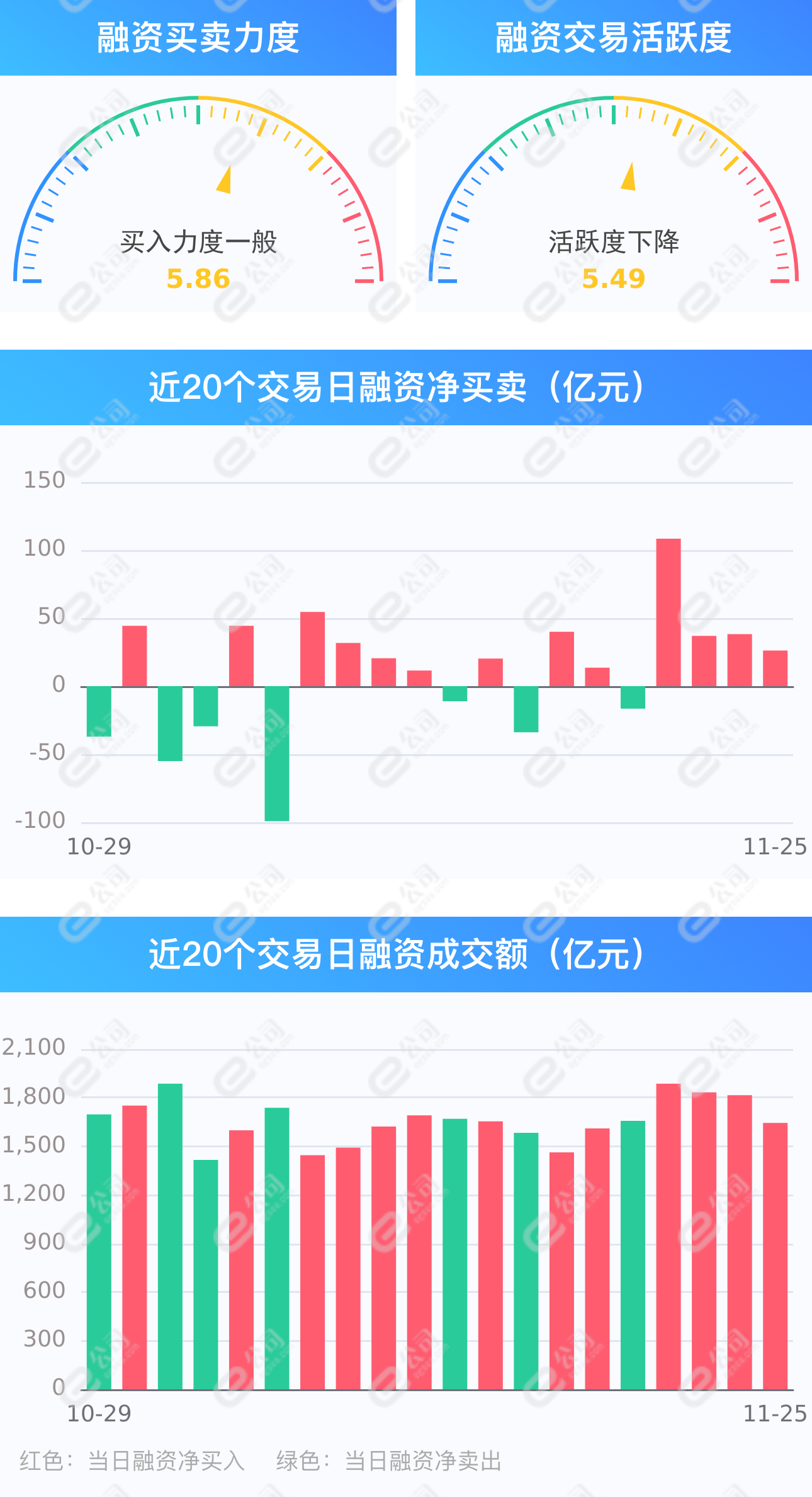 e公司讯,截至11月25日,上交所融资余额报9056.79亿元,较前一交易日增加11.05亿元;深交所融资余额报8156.11亿元,较前一交易日增加15.06亿元;两市合计17212.91亿元,较前一交易日增加26.12亿元,融资交易额1643.64亿元,占A股成交额14.87%,其中融资买入额834.88亿元,融资偿还额808.76亿元,交易活跃度下降9.45%。统计发现,融资客保持连续4日净买入,净买入额分别为108.31亿元、36.87亿元、38.18亿元、26.12亿元,合计209.47亿元。