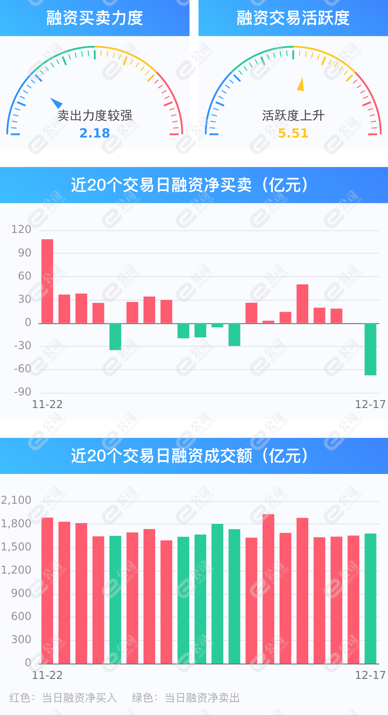 e公司讯,截至12月17日,上交所融资余额报9123.80亿元,较前一交易日减少41.62亿元;深交所融资余额报8137.07亿元,较前一交易日减少25.95亿元;两市合计17260.87亿元,较前一交易日减少67.57亿元,融资交易额1679.85亿元,占A股成交额14.68%,其中融资买入额806.14亿元,融资偿还额873.71亿元,交易活跃度上升1.60%。统计发现,融资客中止连续7日净买入。(此稿由证券时报e公司写稿机器人“快手小e”完成。)