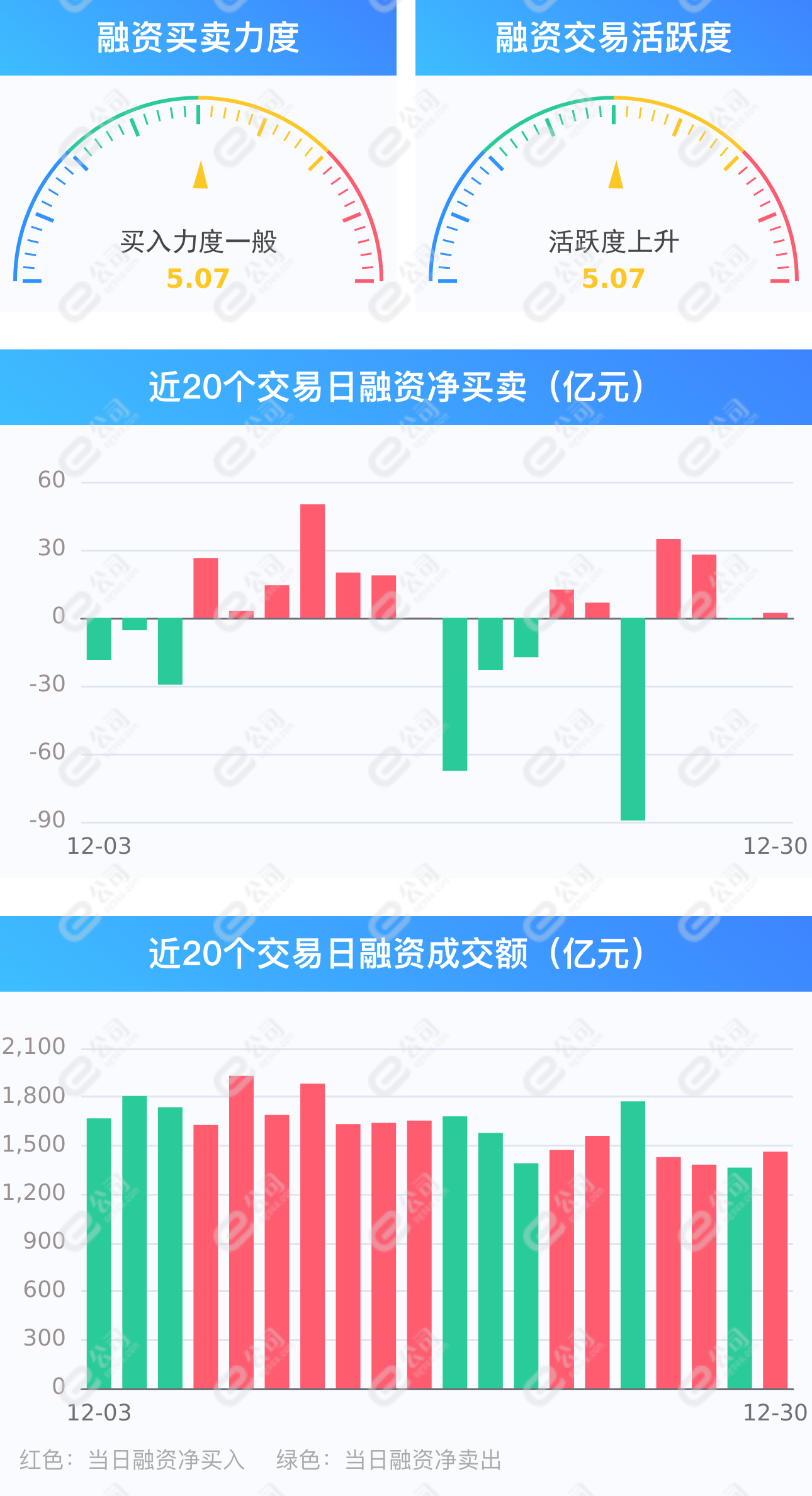 e公司讯,截至12月30日,上交所融资余额报9085.63亿元,较前一交易日减少0.6亿元;深交所融资余额报8128.01亿元,较前一交易日增加2.75亿元;两市合计17213.63亿元,较前一交易日增加2.16亿元,融资交易额1462.35亿元,占A股成交额14.48%,其中融资买入额732.25亿元,融资偿还额730.10亿元,交易活跃度上升7.25%。
