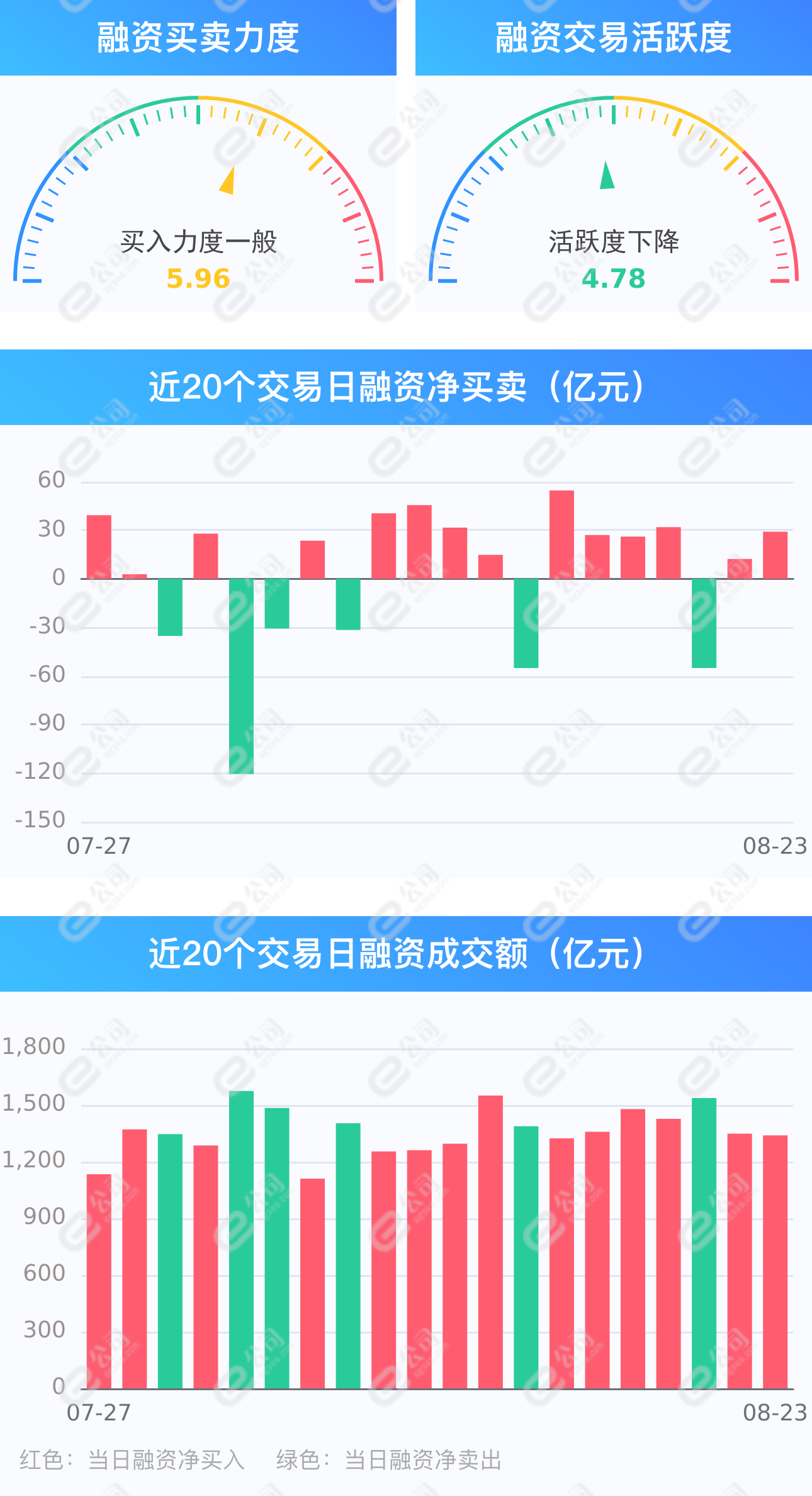 e公司讯,截至8月23日,上交所融资余额报8212.73亿元,较前一交易日增加15.08亿元;深交所融资余额报7136.26亿元,较前一交易日增加14.03亿元;两市合计15348.99亿元,较前一交易日增加29.12亿元,融资交易额1338.95亿元,占A股成交额13.45%,其中融资买入额684.03亿元,融资偿还额654.91亿元,交易活跃度下降0.7%。