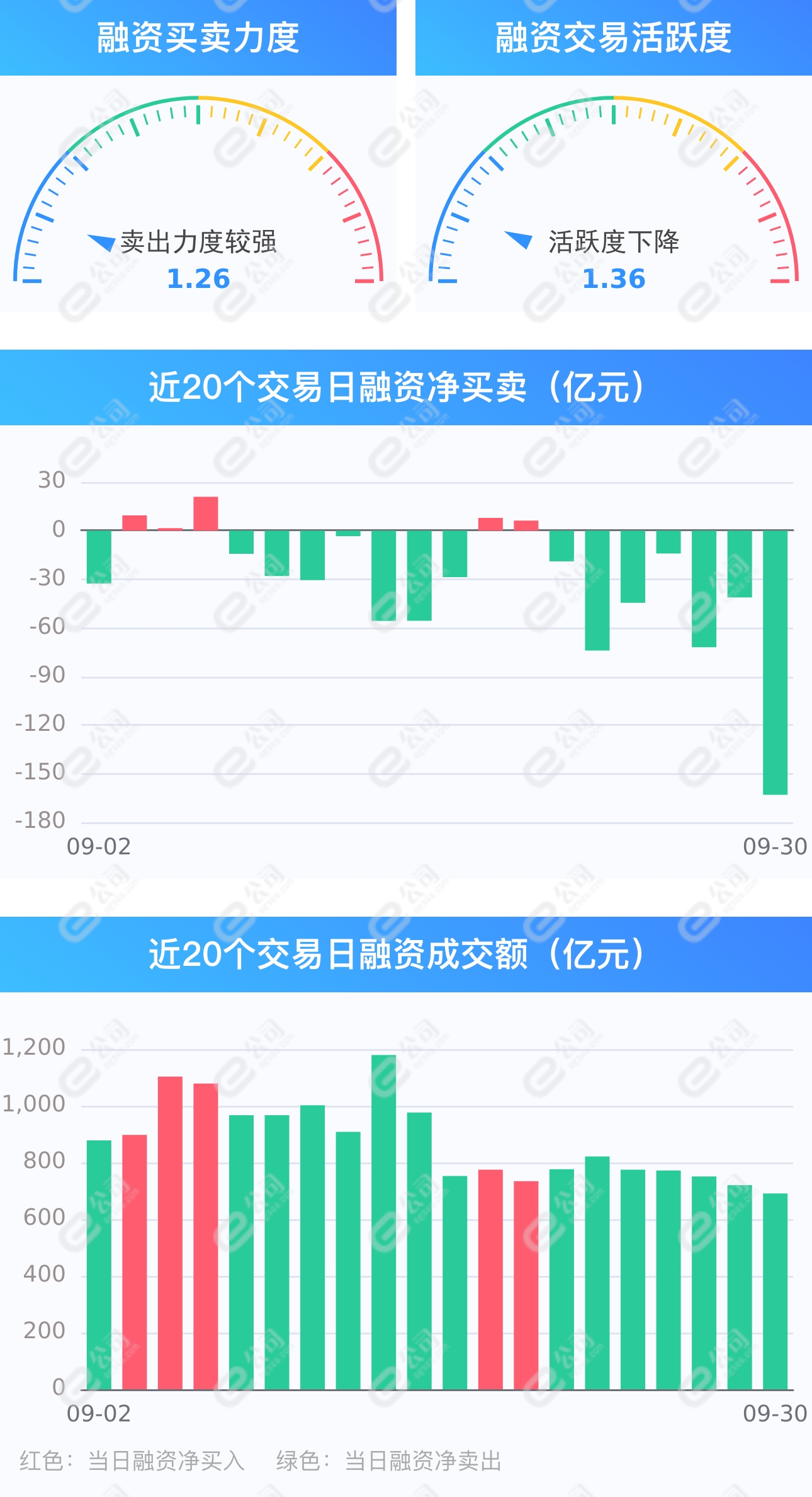 e公司讯,截至9月30日,上交所融资余额报7706.24亿元,较前一交易日减少82.07亿元;深交所融资余额报6729.39亿元,较前一交易日减少81.03亿元;两市合计14435.63亿元,较前一交易日减少163.10亿元,融资交易额690.45亿元,占A股成交额12.31%,其中融资买入额263.68亿元,融资偿还额426.78亿元,交易活跃度下降4.09%。统计发现,融资客保持连续7日净卖出,合计428.11亿元。(此稿由证券时报e公司写稿机器人“快手小e”完成。)