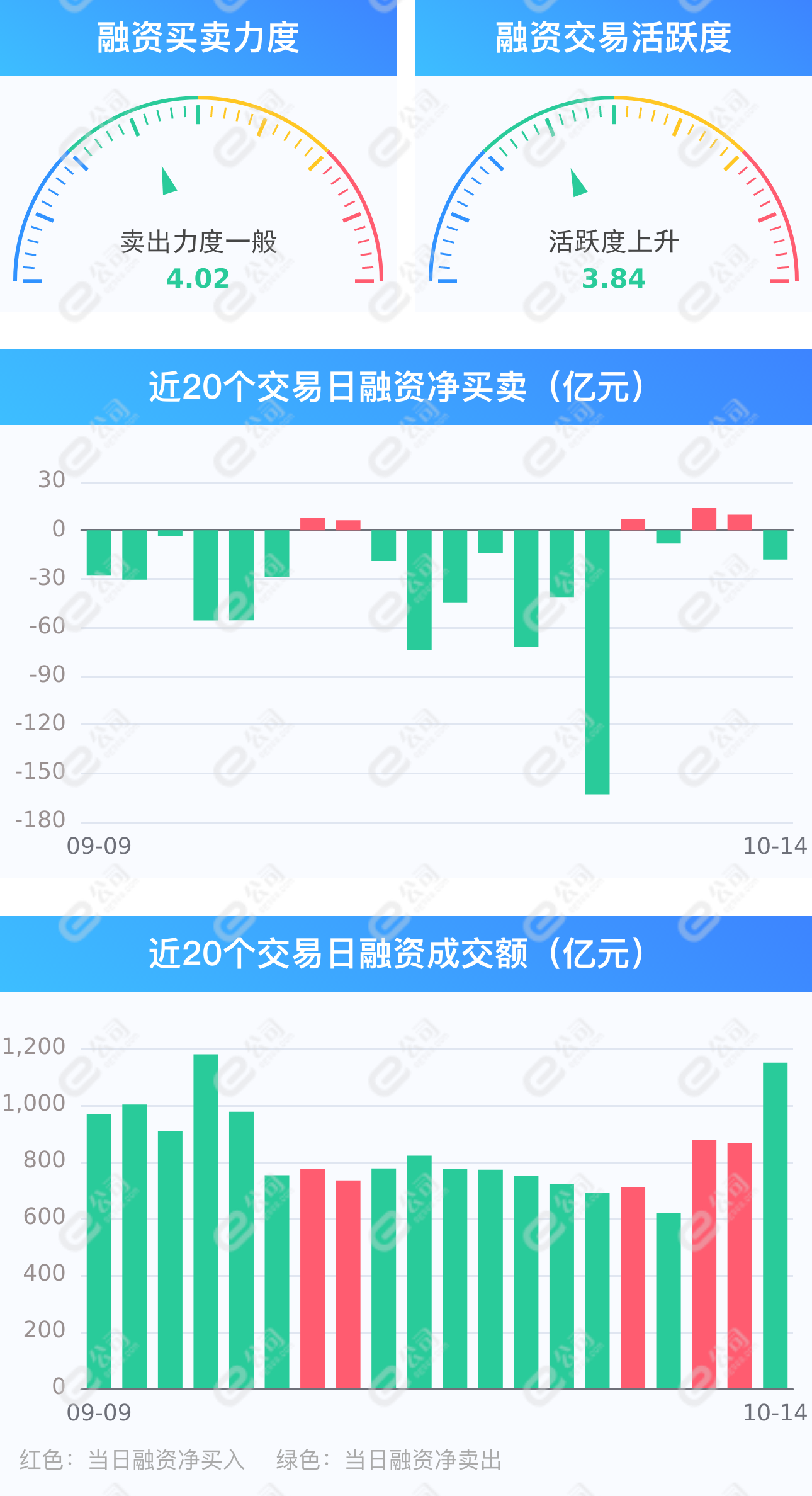 e公司讯,截至10月14日,上交所融资余额报7720.23亿元,较前一交易日减少3.53亿元;深交所融资余额报6719.21亿元,较前一交易日减少14.57亿元;两市合计14439.44亿元,较前一交易日减少18.10亿元,融资交易额1149.43亿元,占A股成交额13.35%,其中融资买入额565.67亿元,融资偿还额583.77亿元,交易活跃度上升32.66%。