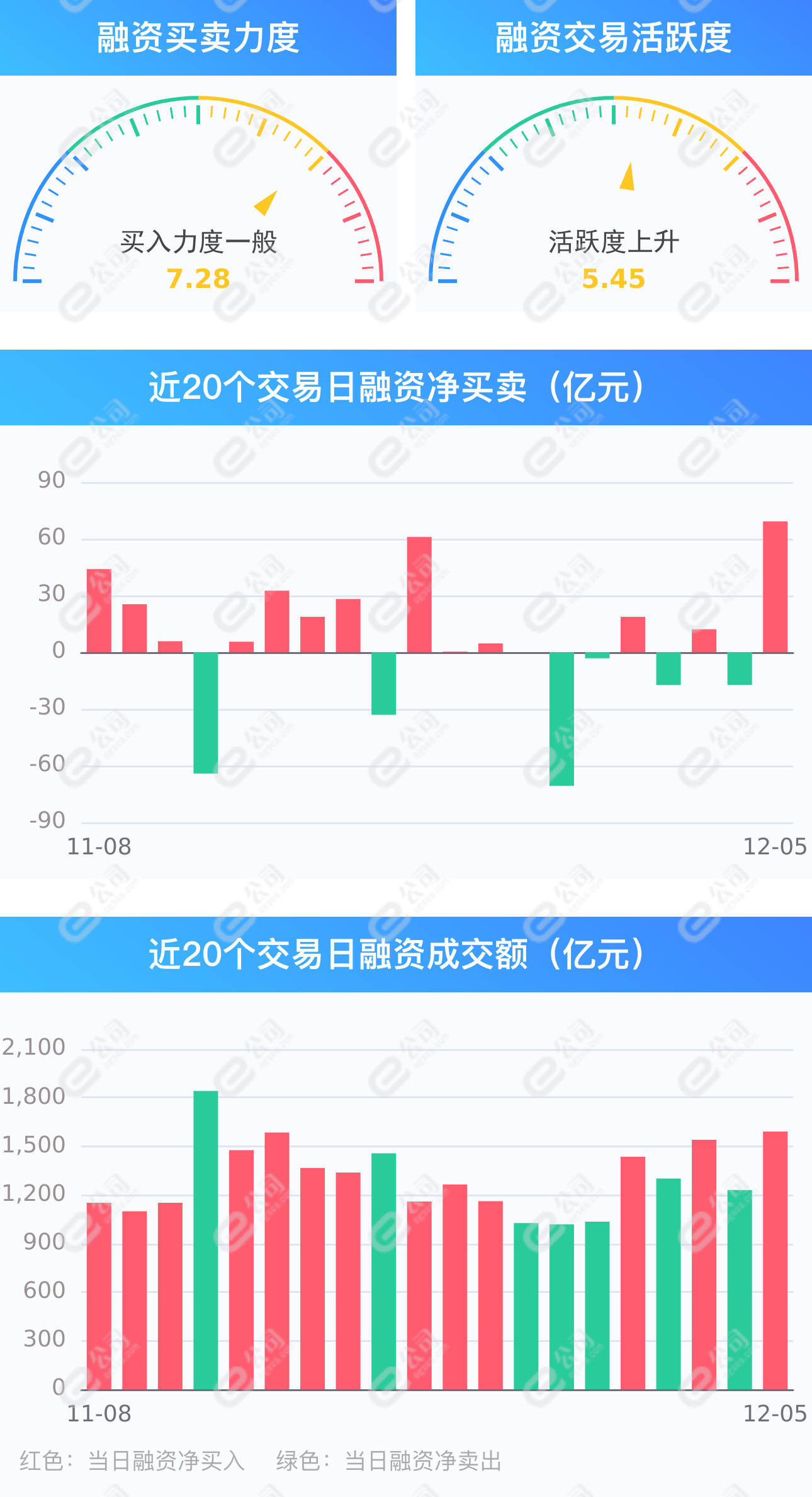 e公司讯,截至12月5日,上交所融资余额报7760.40亿元,较前一交易日增加38.55亿元;深交所融资余额报6947.06亿元,较前一交易日增加30.62亿元;两市合计14707.46亿元,较前一交易日增加69.17亿元,融资交易额1590.32亿元,占A股成交额15.17%,其中融资买入额829.74亿元,融资偿还额760.57亿元,交易活跃度上升29.32%。