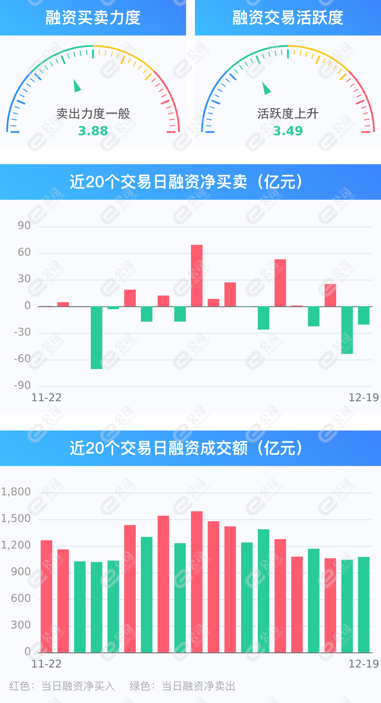 e公司讯,截至12月19日,上交所融资余额报7732.96亿元,较前一交易日减少14.37亿元;深交所融资余额报6964.39亿元,较前一交易日减少6.31亿元;两市合计14697.34亿元,较前一交易日减少20.69亿元,融资交易额1076.22亿元,占A股成交额14.22%,其中融资买入额527.77亿元,融资偿还额548.45亿元,交易活跃度上升3.08%。(此稿由证券时报e公司写稿机器人“快手小e”完成。)