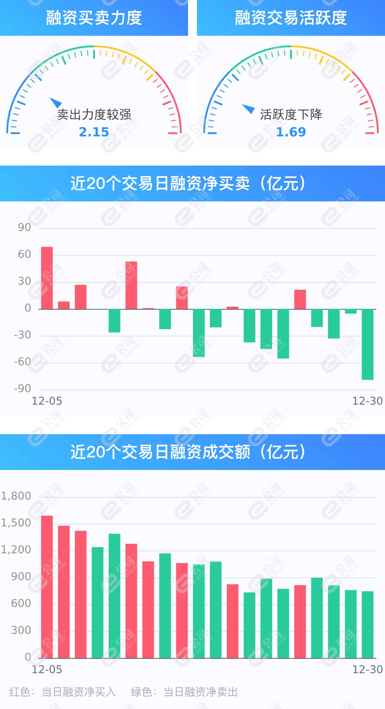 e公司讯,截至12月30日,上交所融资余额报7625.14亿元,较前一交易日减少42.46亿元;深交所融资余额报6819.96亿元,较前一交易日减少36.91亿元;两市合计14445.11亿元,较前一交易日减少79.37亿元。统计发现,融资客保持连续4日净卖出,净卖出额分别为20.19亿元、33.18亿元、5.37亿元、79.37亿元,合计138.11亿元。