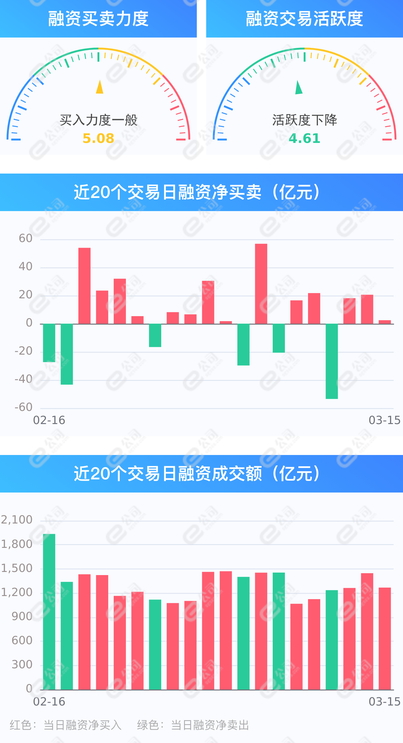 e公司讯,截至3月15日,上交所融资余额报7867.34亿元,较前一交易日增加6.87亿元;深交所融资余额报7077.23亿元,较前一交易日减少4.44亿元;两市合计14944.57亿元,较前一交易日增加2.43亿元,融资交易额1267.90亿元,占A股成交额15.53%,其中融资买入额635.17亿元,融资偿还额632.73亿元,交易活跃度下降12.35%。