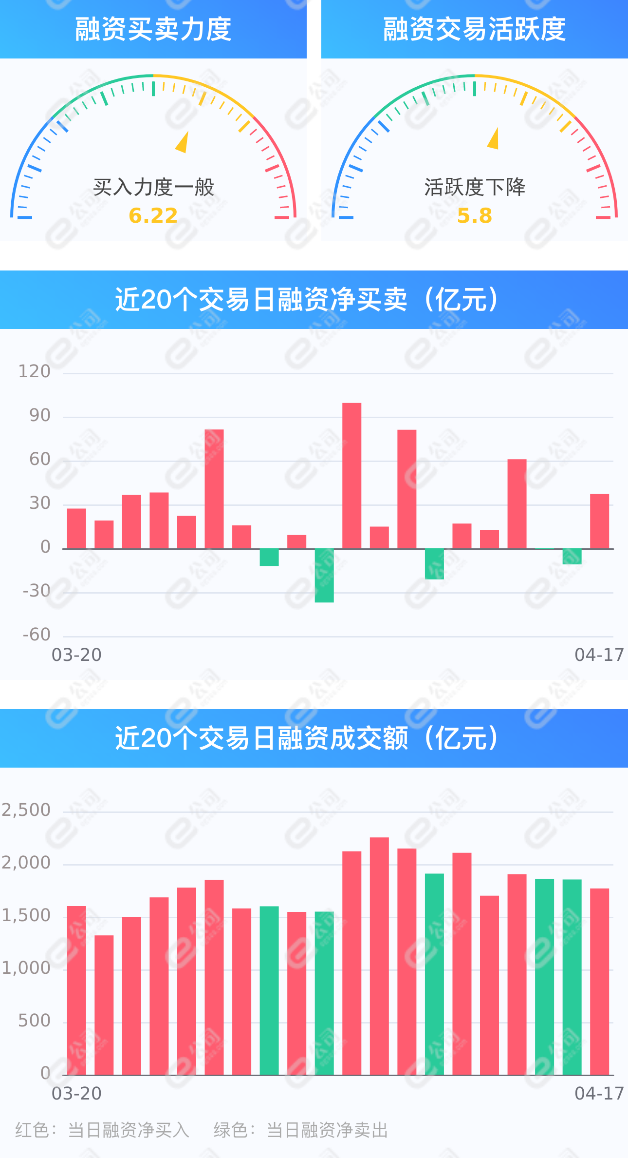 e公司讯,截至4月17日,上交所融资余额报8046.83亿元,较前一交易日增加19.14亿元;深交所融资余额报7372.00亿元,较前一交易日增加18.04亿元;两市合计15418.82亿元,较前一交易日增加37.17亿元,融资交易额1768.86亿元,占A股成交额15.78%,其中融资买入额903.02亿元,融资偿还额865.84亿元,交易活跃度下降4.63%。(此稿由证券时报e公司写稿机器人“快手小e”完成。)