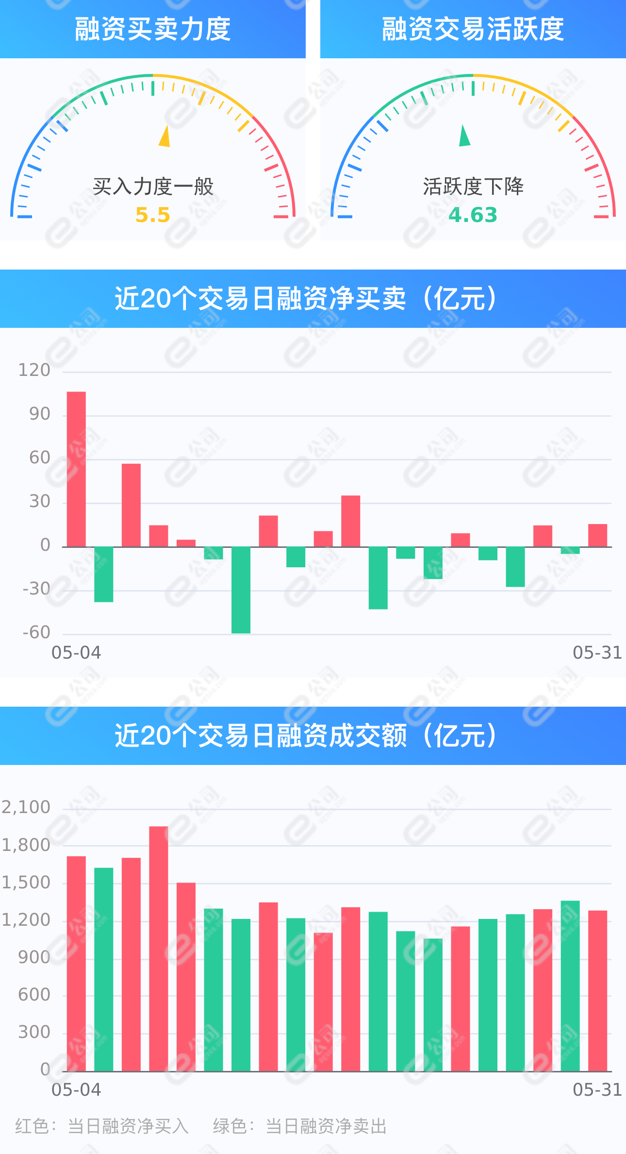 e公司讯,截至5月31日,上交所融资余额报7960.16亿元,较前一交易日减少0.06亿元;深交所融资余额报7226.71亿元,较前一交易日增加15.36亿元;两市合计15186.87亿元,较前一交易日增加15.30亿元,融资交易额1284.26亿元,占A股成交额13.68%,其中融资买入额649.78亿元,融资偿还额634.48亿元,交易活跃度下降5.80%。