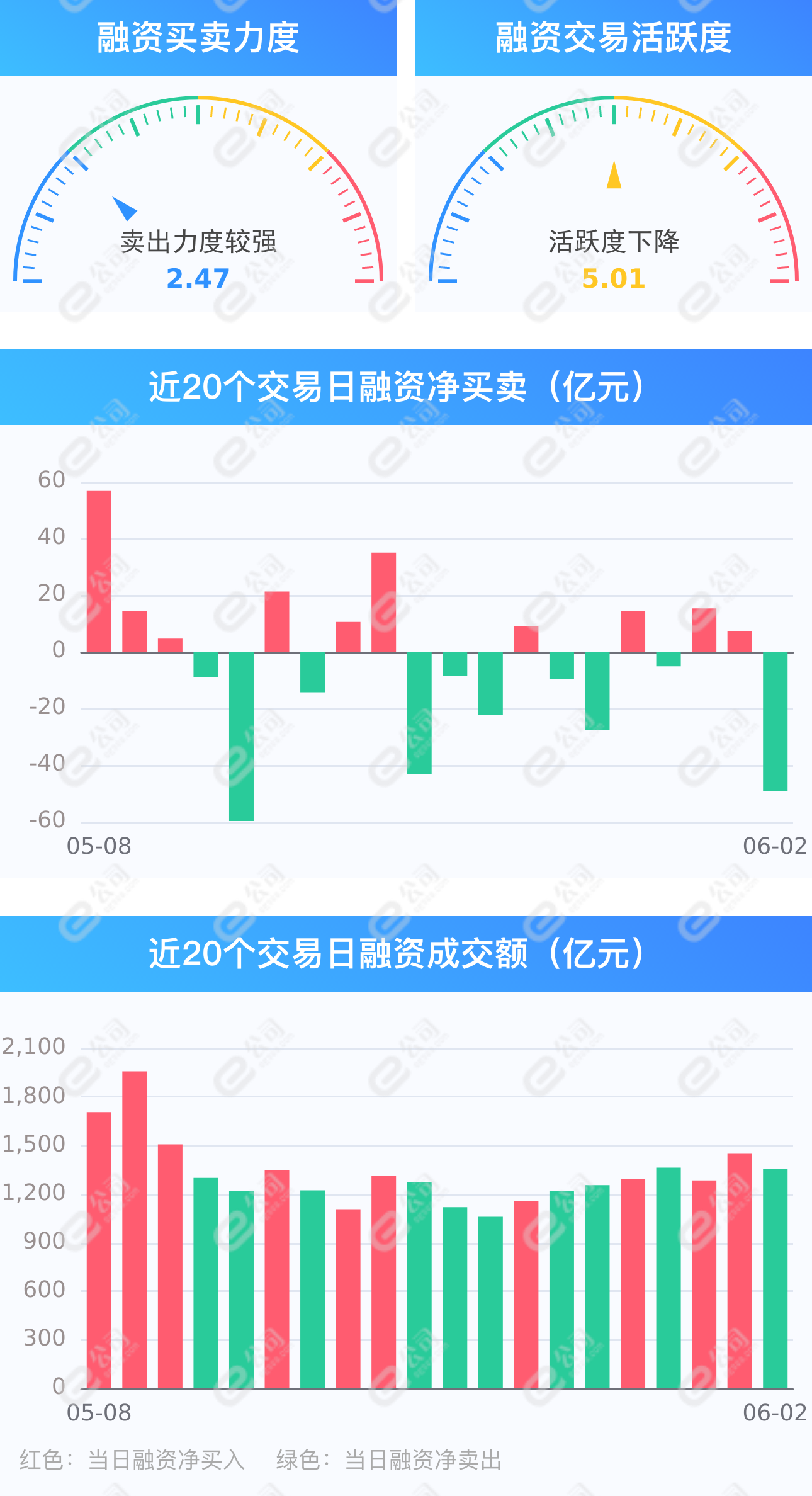 e公司讯,截至6月2日,上交所融资余额报7937.63亿元,较前一交易日减少28.56亿元;深交所融资余额报7207.39亿元,较前一交易日减少20.65亿元;两市合计15145.02亿元,较前一交易日减少49.21亿元,融资交易额1356.77亿元,占A股成交额14.42%,其中融资买入额653.78亿元,融资偿还额702.99亿元,交易活跃度下降6.35%。