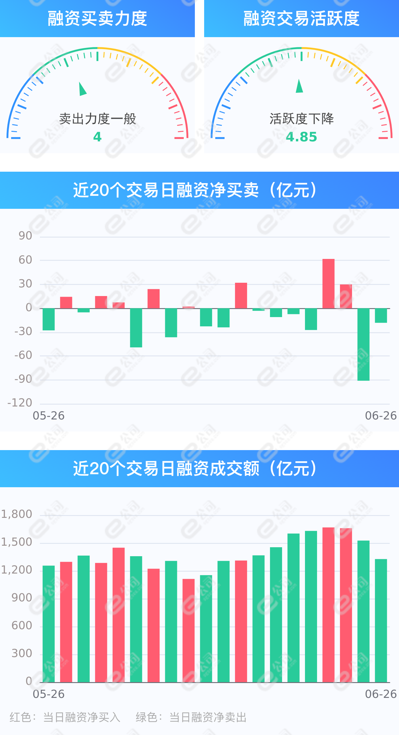 e公司讯,截至6月26日,上交所融资余额报7877.12亿元,较前一交易日增加6.75亿元;深交所融资余额报7176.11亿元,较前一交易日减少25.09亿元;两市合计15053.24亿元,较前一交易日减少18.34亿元,融资交易额1326.22亿元,占A股成交额13.57%,其中融资买入额653.94亿元,融资偿还额672.28亿元,交易活跃度下降13.06%。(此稿由证券时报e公司写稿机器人“快手小e”完成。)