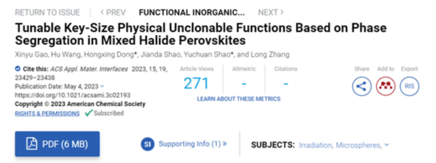 e公司讯,从中科院上海光机所获悉,近日,中国科学院上海光学精密机械研究所红外光功能材料研究中心董红星研究员团队与薄膜光学实验室合作,报道了混合卤素钙钛矿材料的可逆相分离现象,实现了密钥尺寸可调的物理不可克隆函数。物理不可克隆函数(PUF)是一种很有前途的防伪方法,即使采用相同的制作工艺,由于不可避免的物理构造中的随机偏差,也会产生唯一且不可预测的密钥。然而,目前大多数光学PUF通常具有固定的激励-响应对、静态的编码结构和固定的密钥尺寸,导致编码容量和安全性相对较低,这极大地阻碍了实际发展。