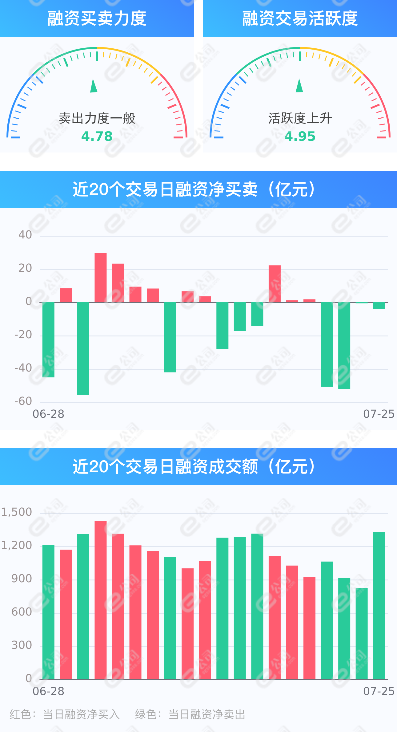 e公司讯,截至7月25日,上交所融资余额报7734.96亿元,较前一交易日减少6.79亿元;深交所融资余额报7114.00亿元,较前一交易日增加2.73亿元;两市合计14848.96亿元,较前一交易日减少4.06亿元,融资交易额1330.18亿元,占A股成交额14.11%,其中融资买入额663.06亿元,融资偿还额667.12亿元,交易活跃度上升61.52%。统计发现,融资客保持连续4日净卖出,净卖出额合计107.61亿元。