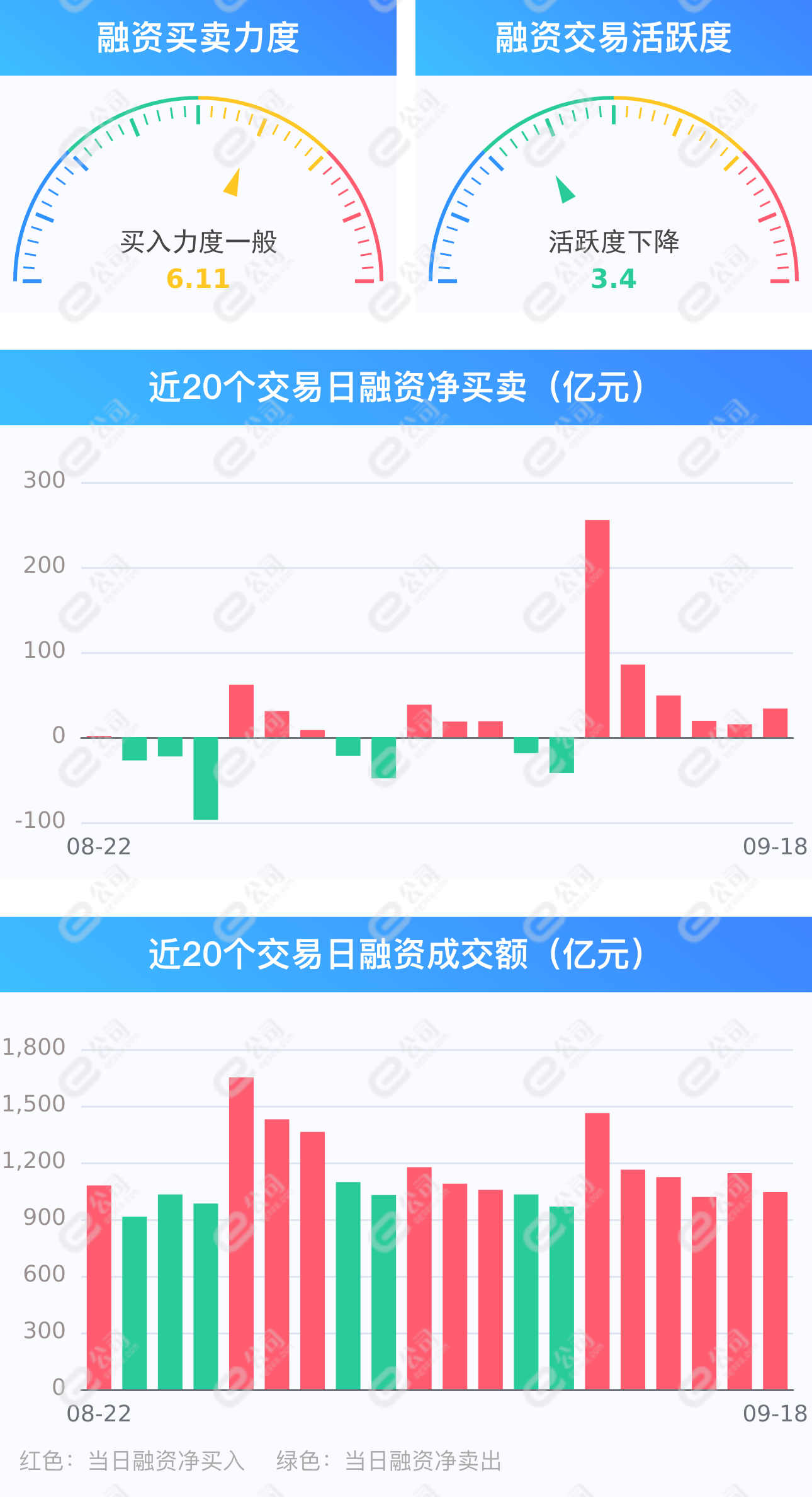e公司讯,截至9月18日,上交所融资余额报8017.63亿元,较前一交易日增加23.54亿元;深交所融资余额报7177.47亿元,较前一交易日增加10.15亿元;两市合计15195.10亿元,较前一交易日增加33.68亿元,融资交易额1043.16亿元,占A股成交额14.99%,其中融资买入额538.42亿元,融资偿还额504.74亿元,交易活跃度下降8.74%。统计发现,融资客保持连续6日净买入,合计457.89亿元。