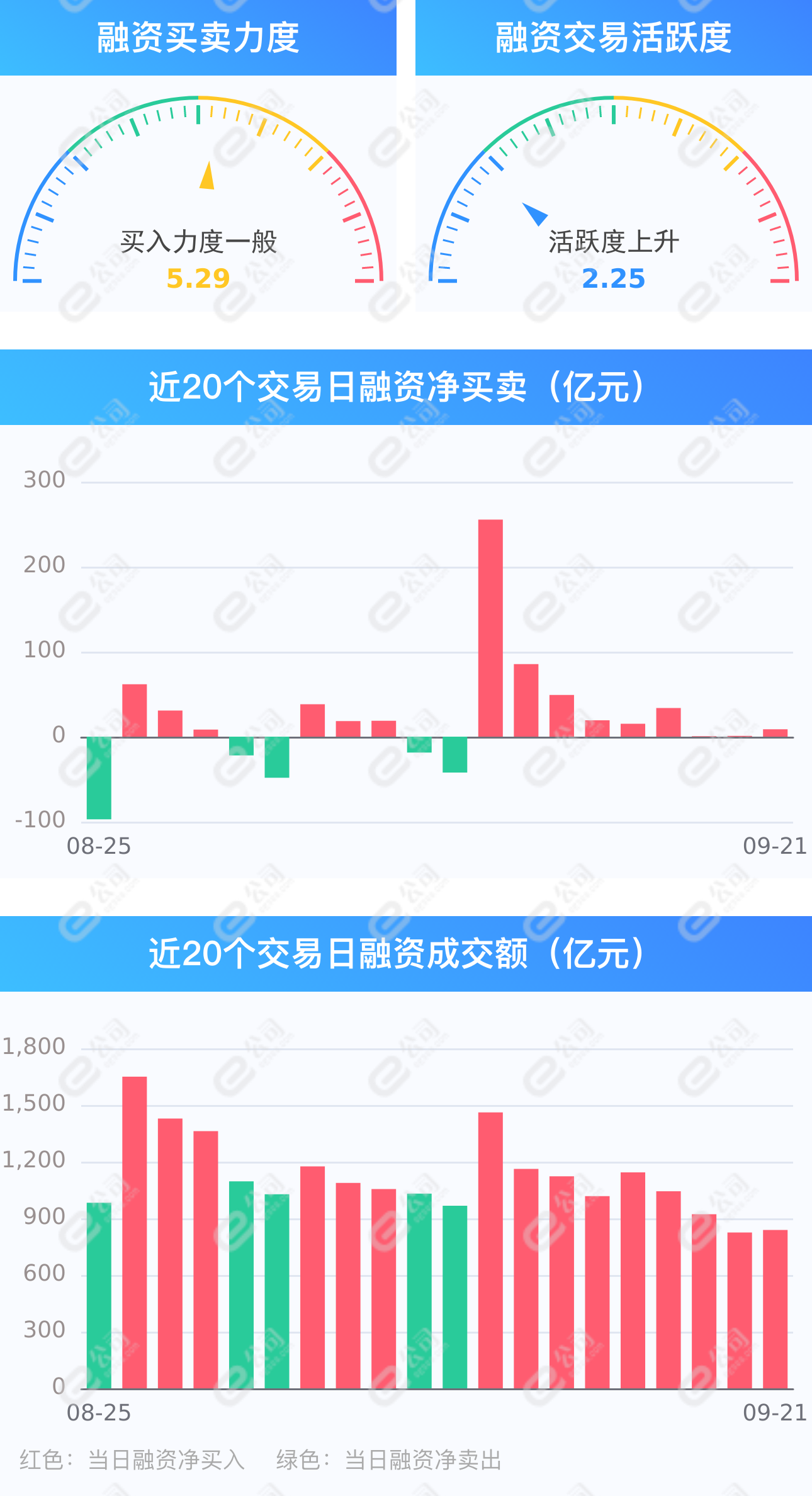 e公司讯,截至9月21日,上交所融资余额报8021.22亿元,较前一交易日增加4.69亿元;深交所融资余额报7184.01亿元,较前一交易日增加4.05亿元;两市合计15205.23亿元,较前一交易日增加8.74亿元,融资交易额838.03亿元,占A股成交额14.52%,其中融资买入额423.39亿元,融资偿还额414.64亿元,交易活跃度上升1.56%。统计发现,融资客保持连续9日净买入,合计468.02亿元。