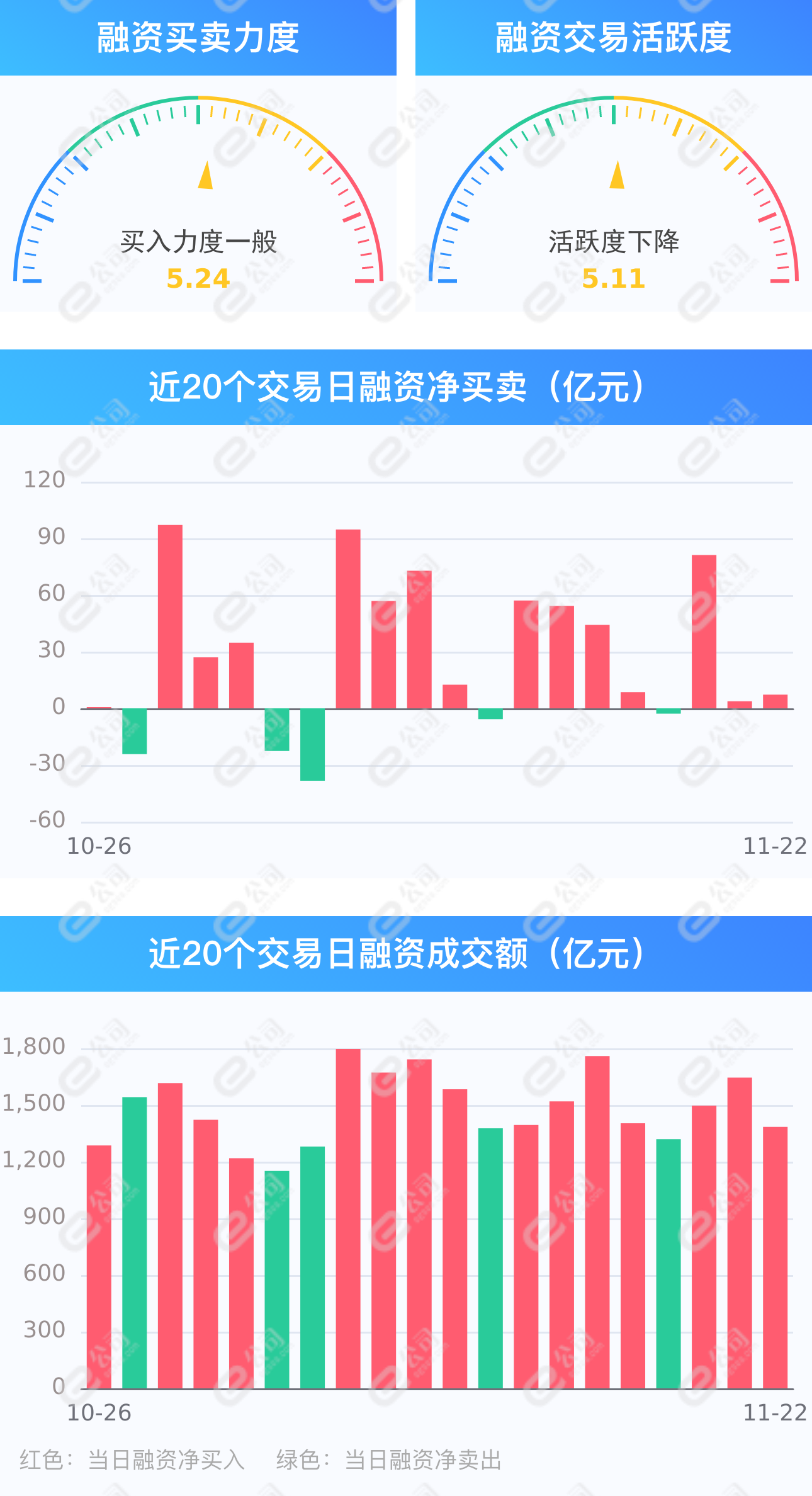 e公司讯,截至11月22日,上交所融资余额报8347.47亿元,较前一交易日增加4.15亿元;深交所融资余额报7602.28亿元,较前一交易日增加3.09亿元;两市合计15949.75亿元,较前一交易日增加7.25亿元,融资交易额1383.76亿元,占A股成交额15.81%,其中融资买入额695.50亿元,融资偿还额688.26亿元,交易活跃度下降15.88%。