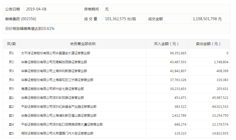 e公司讯,4月8日,赫美集团 (002356)连日跌停后上演地天板,盘后数据显示,券商营业部资金博弈激烈,华泰证券多个营业部登榜。买一席位太平洋证券许昌建安大道营业部买入9635万元,华泰证券无锡解放西路营业部、上海共和新路营业部、上海普陀区江宁路营业部均买入约4000万元。卖方方面,卖一席位华泰证券深圳彩田路营业部卖出4599万元。