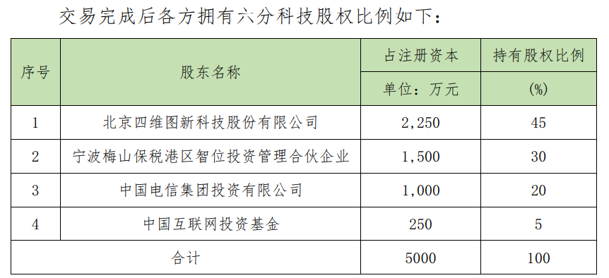 e公司讯,四维图新(002405)4月26日晚间公告,子公司六分科技拟增资扩股,引入战略投资者和财务投资者,具体引入宁波梅山保税港区智位投资管理合伙企业、中国电信集团投资有限公司、中国互联网投资基金,三者将分别认购六分科技1500万元、1000万元、250万元新增注册资本。六分科技成立于2018年3月,主要从事高精度定位的产品研发和商业化应用服务。