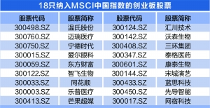 MSCI公司5月14日宣布5月份半年度指数审议结果,决定将26只中国A股纳入MSCI中国A股大盘股指数,包含股票总数升至264只。新纳入的26只股票中,有18只来自创业板,这是创业板股票首次入摩,此前238只成份股的纳入因子将从5%增至10%。审议结果将在5月28日收盘后生效。此后两步提高纳入比例将分别在8月和11月执行,分别提高至15%、20%。