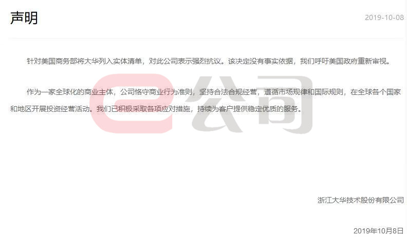 e公司讯,针对美国商务部将公司列入实体清单,大华股份表示强烈抗议。大华股份称,该决定没有事实依据,呼吁美国政府重新审视。作为一家全球化的商业主体,公司恪守商业行为准则,坚持合法合规经营,遵循市场规律和国际规则,在全球各个国家和地区开展投资经营活动。公司已积极采取各项应对措施,持续为客户提供稳定优质的服务。