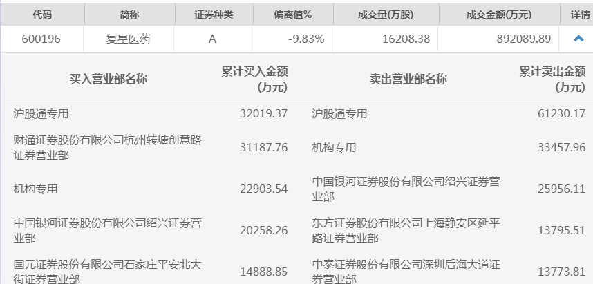 e公司讯,复星医药(600196)5月6日跌停。龙虎榜数据显示,北向资金、机构资金净卖出该股。其中,北向资金买入3.2亿元并卖出6.1亿元,估算净卖出2.9亿元。一个机构席位买入2.3亿元,一个机构席位卖出3.3亿元。买二席位财通证券杭州转塘创意路买入3.1亿元;买四席位中国银河证券绍兴证券营业部买入2.0亿元并卖出2.6亿元。