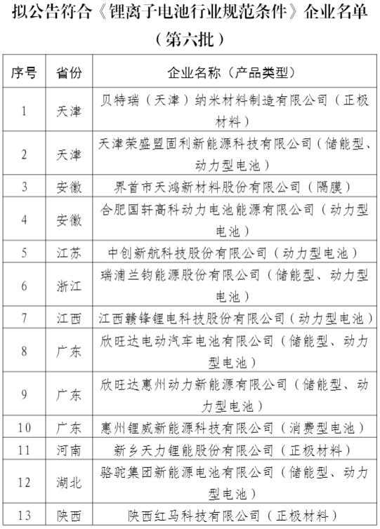 e公司讯,工信部:现将拟公告符合《锂离子电池行业规范条件》企业名单(第六批)予以公示。北京国能电池科技有限公司等6家已公告企业,因不能保持规范条件要求,拟撤销其规范条件企业名单,一并予以公示。