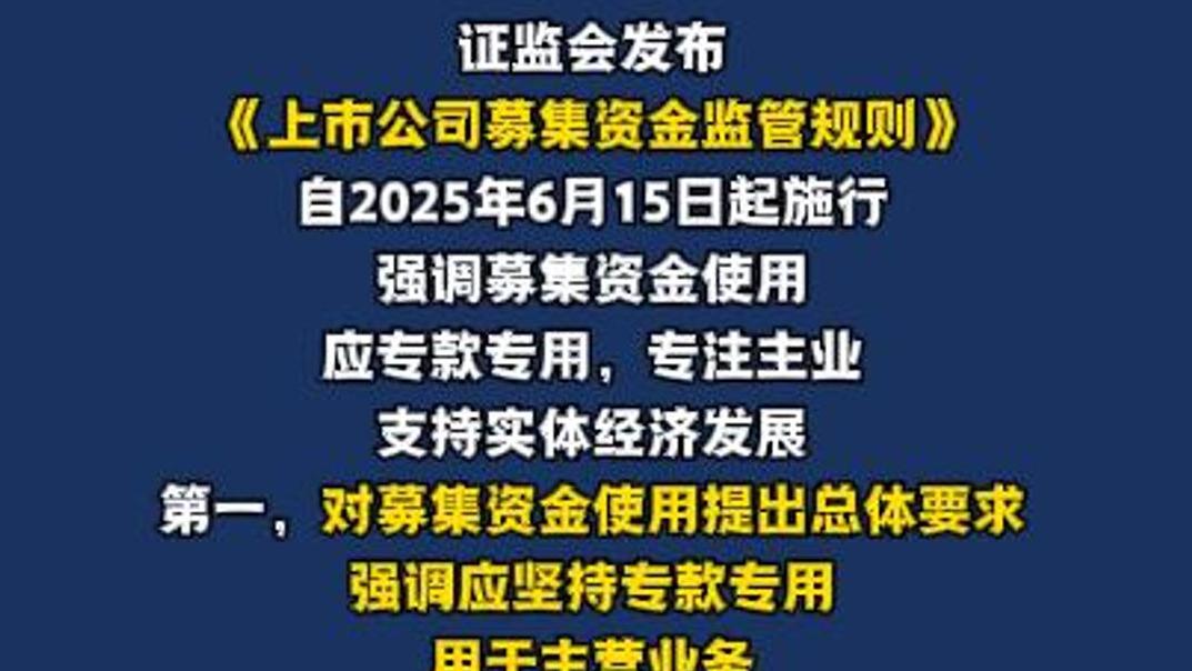 证监会发布《上市公司募集资金监管规则》 ,不得用于永久补充流动资金和偿还银行借款,自6月15日起施行