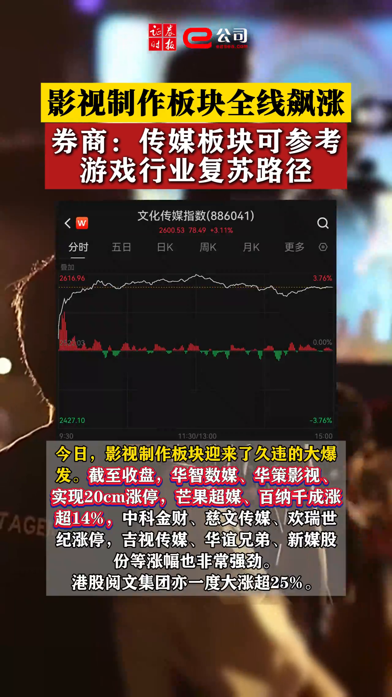 影视制作板块全线飙涨 券商:传媒板块可参考游戏行业复苏路径
