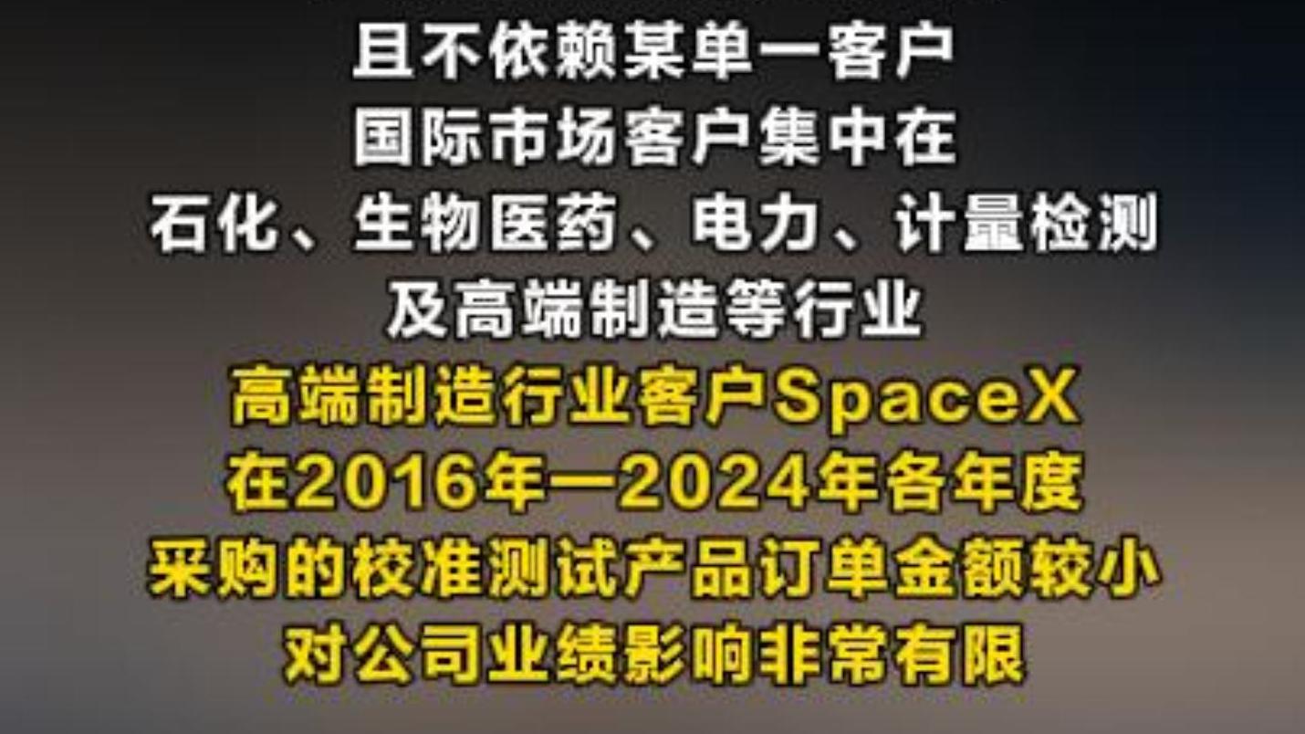 康斯特:SpaceX在2016年—2024年各年度采购的校准测试产品订单金额较小,对公司业绩影响非常有限