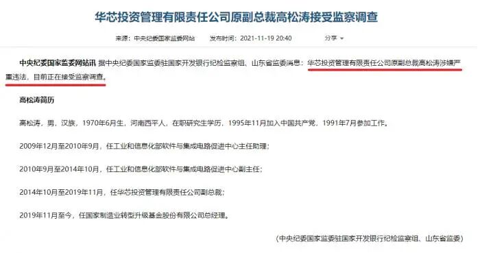 近日,中央纪委国家监委网站披露,“华芯投资管理有限责任公司(下称华芯投资)原副总裁高松涛涉嫌严重违法,目前正在接受监察调查。”