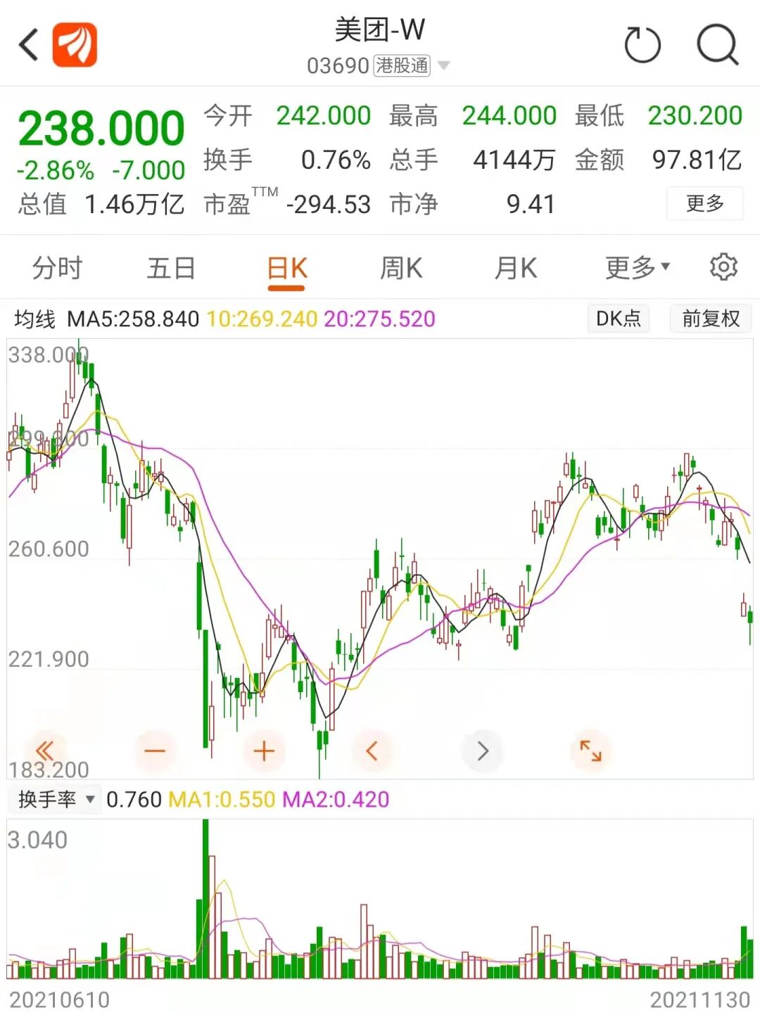 美团盘中再次大幅下跌,盘中跌幅一度在5%左右。美团昨天大跌7.06%。本月中旬,美团股价一度逼近300港元,但此后再次陷入调整,披露季度业绩后跌幅进一步加剧,在短短10个交易日的时间里股价最大调整幅度已超过两成。截至收盘,跌幅收窄至2.86%。