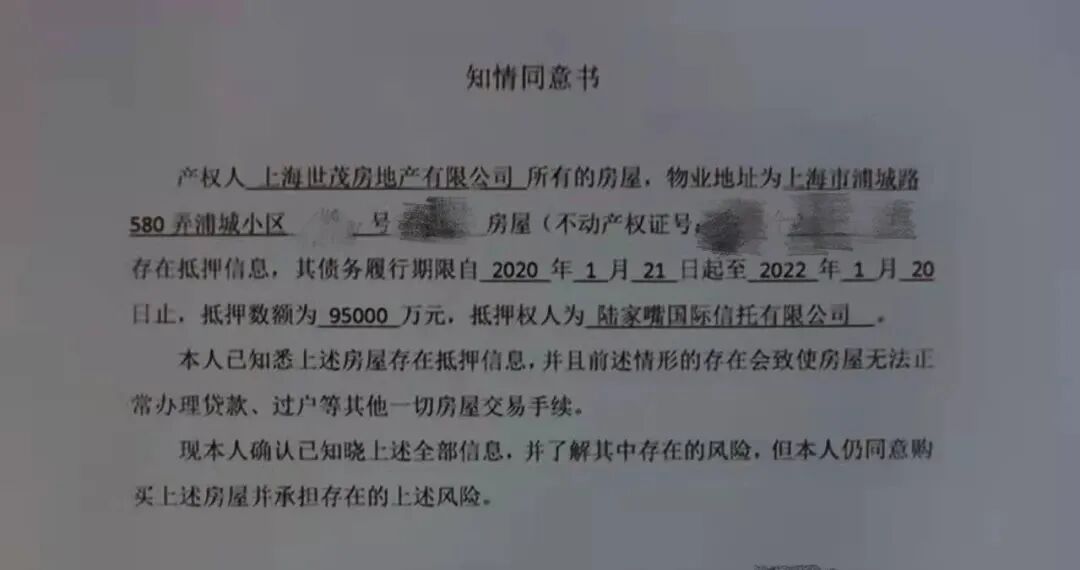 一份打印于10月18日的不动产登记薄显示,此次出售的浦城小区房源已被抵押给了陆家嘴国际信托有限公司(下称“陆家嘴信托”),期限从2020年1月21日到2022年1月20日,债券数额9.5亿元。