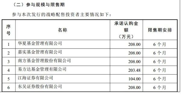 本次发行战略配售发行数量为169.57万股。券商中国记者注意到,不少知名机构,像华夏基金、嘉实基金、易方达等基金公司,以及江海证券、东吴证券等券商纷纷参与战略配售。