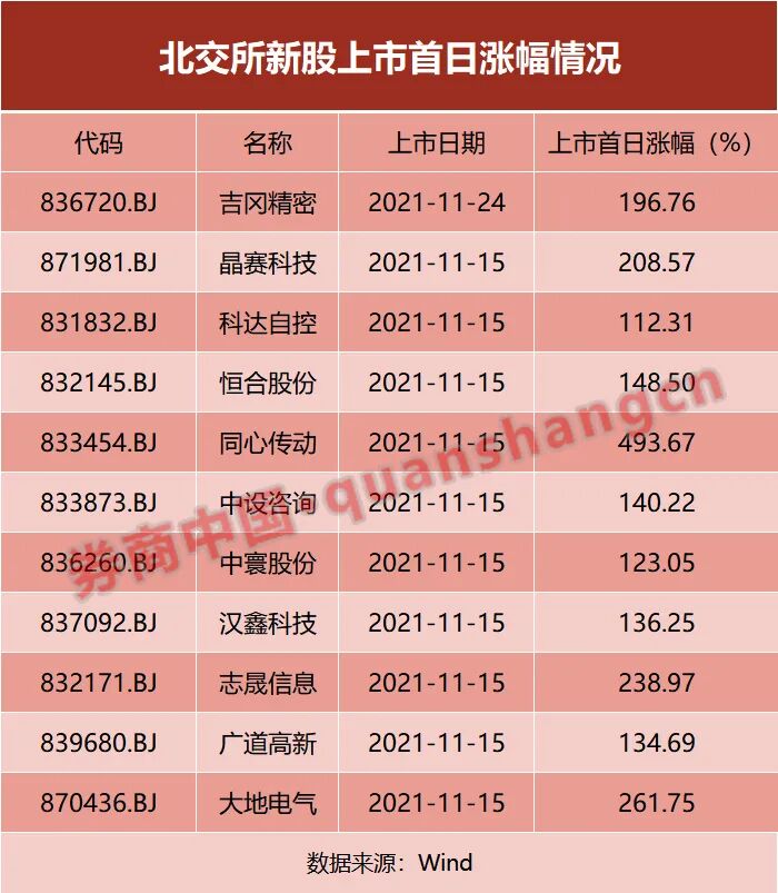由于北交所开市首日首批新股表现亮眼,不少新股大涨2倍、3倍,同心传动上市首日涨幅更是高达494%,而且这批新股即使满月之后,平均涨幅也有110%,轻轻松松翻倍。这让打新一族对于北交所新股“虎视眈眈”。