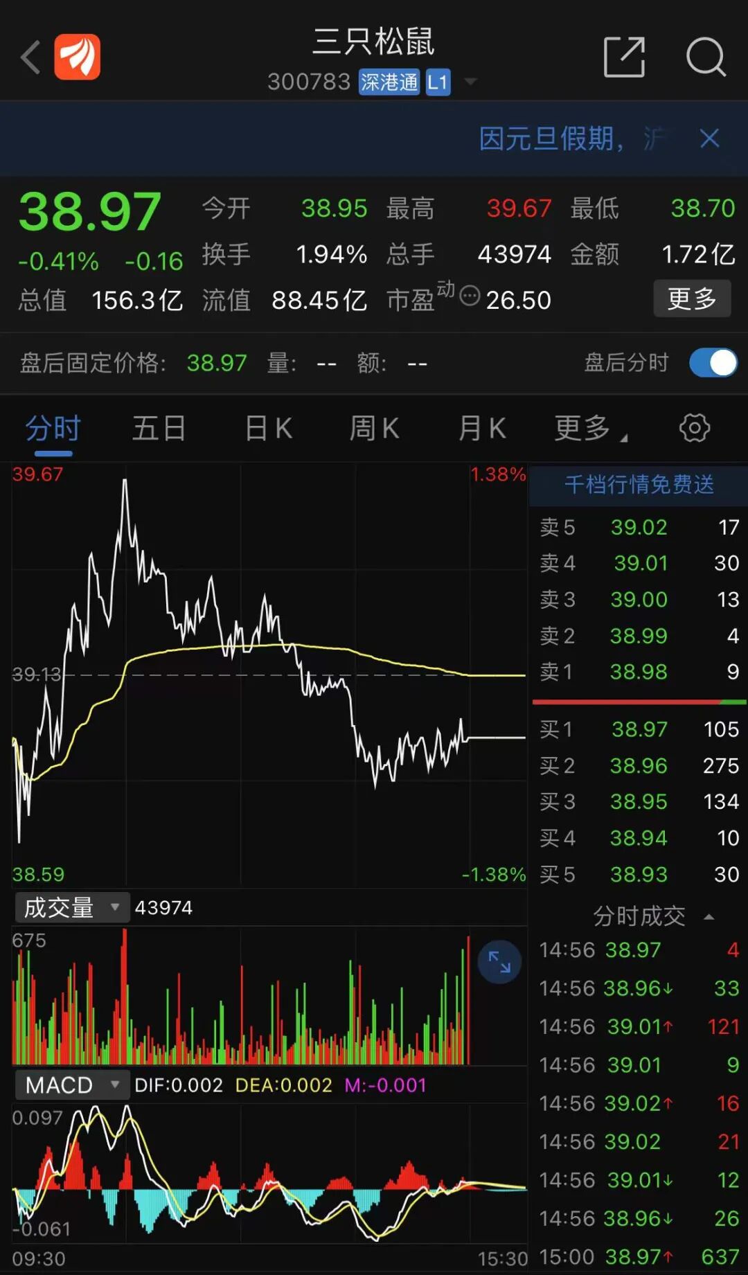 股价方面,截至最新,三只松鼠报38.97元/股,总市值156.3亿元。