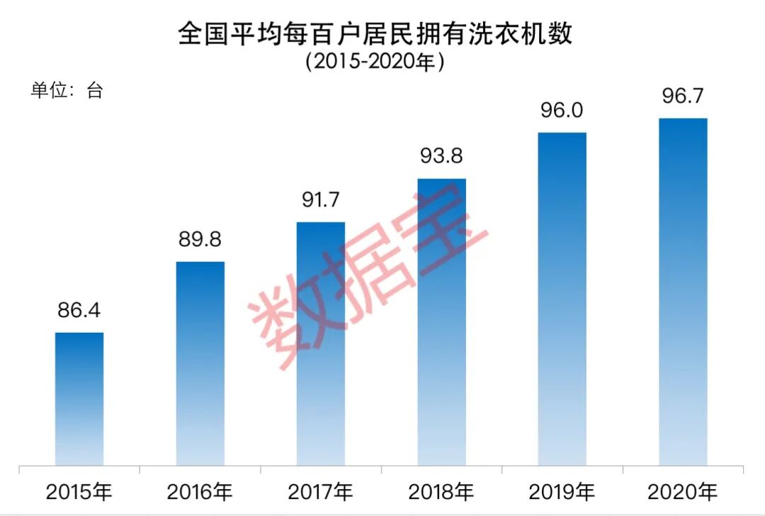 搓澡完毕该洗衣,从2015~2020年全国居民平均每百户年末拥有洗衣机的数据来看,人均一台洗衣机是基本实现的画面。