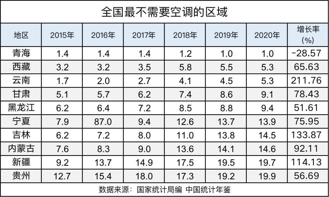 既然有最需要空调的地方,当然也有最不care空调的地方了。青海由于海拔和地理位置原因导致冬季寒冷漫长,夏季凉爽短暂。空调拥有量从2015年到2020年居然呈现了负增长率-28.57%。荣获最不care空调的区域榜首。