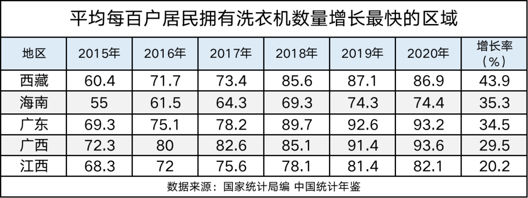 从增长率看,洗衣机拥有量增长最多的区域是西藏,2015年西藏每十户居民平均只拥有6.04台洗衣机,到2020年增加至8.69台洗衣机,增长率为43.9%。让人意外的是广东这个经济比较发达的区域,在2015年平均每十户拥有洗衣机量只有6.93台,与西藏差别并不大。