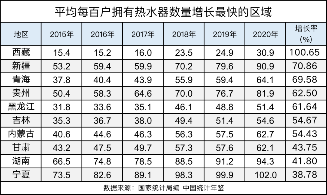 新疆从2015年的每百户拥有53.2台,到2020年拥有90.9台,得益于城镇化建设新疆区域基本实现了搓澡自由,可以想搓就搓了!