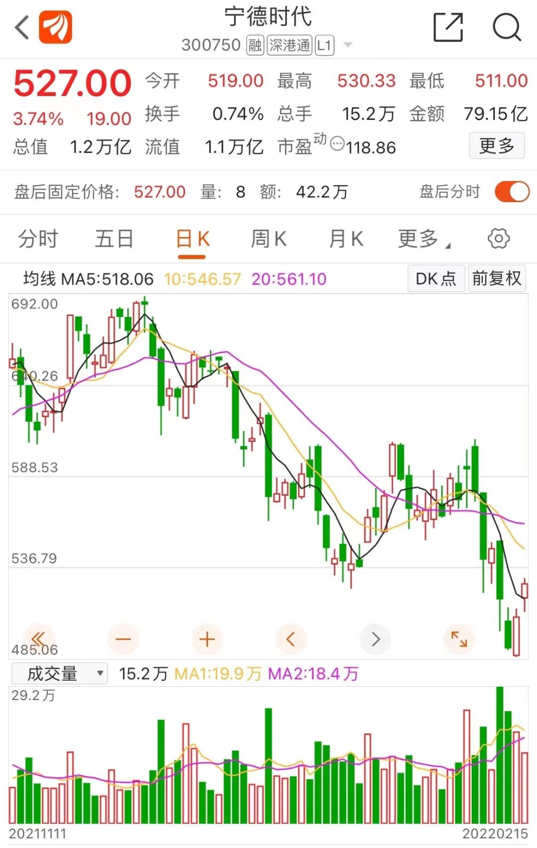 2月15日,宁德时代报收527.00元/股,涨3.74%,最新市值1.23万亿元人民币。