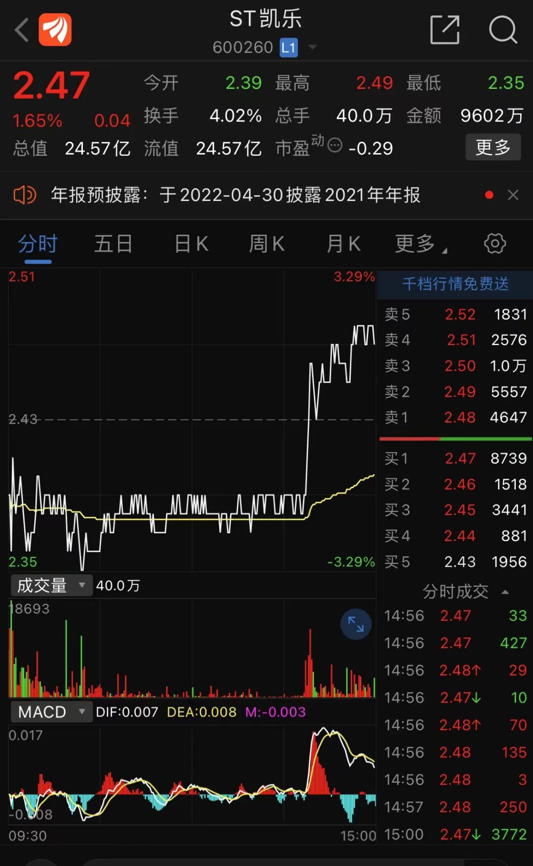 行情数据显示,ST凯乐最新股价报2.47元/股,总市值24.57亿元。