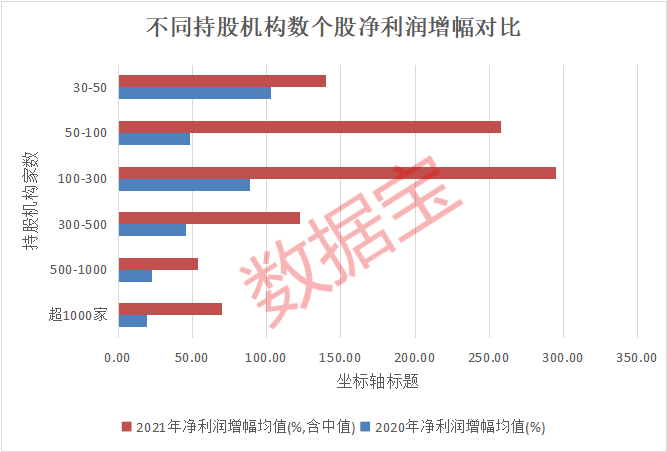 以2021年春节后抱团股的撤退情况来看,获1000家以上机构持仓股(取2020三季报数据),2020年净利润增幅低于20%,500家至1000家机构持股公司同期净利润增幅均值22.6%。100家至300家、50家至100家机构持股公司2020年净利润增幅均值均超过45%,2021年净利润增幅均值均在250%以上,超过500家以上机构持股公司的净利润增幅。