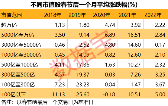 为分析大盘股和小盘股春节后的表现,数据宝根据市值分类(以春节前最后一个交易日为基准日),分别计算春节后一个月的表现。2020年、2021年大市值股回撤幅度较大,其中5000亿至万亿股平均下跌6.89%、16.51%。2018、2019、2022年,大市值股表现均弱于小市值股。以2022年为例,3000亿至5000亿股春节后一个月平均下跌0.17%,百亿以下市值股平均涨幅5%。