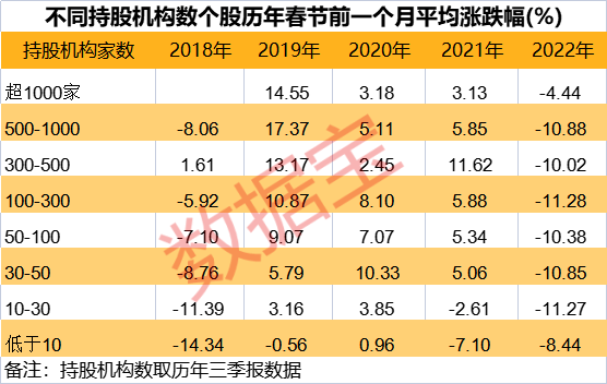 机构抱团股春节后大幅回撤,并非是2022年仅有的“春节效应”。复盘2018年-2021年春节后的时长表现,2021年春节后,机构抱团股回撤最为显著,获1000家以上机构持股的公司春节后一个月平均下跌近17%,获500家至1000家机构持股公司同期下跌15%以上;持股10家至30家公司同期平均涨2%左右,低于10家机构持股的公司平均涨幅超10%。