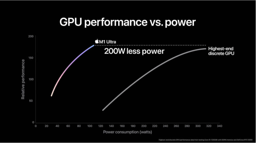 此次发布会中,Mac系列是最大的主角,苹果花了大量篇幅来介绍M1 Ultra芯片,并称之为“全球最强”。这颗芯片采用Ultra Fusion架构将两颗M1 Max连接在一起,20颗CPU+64核GPU的加持以及拥有32核神经引擎,采用5nm工艺制造,拥有1114亿个晶体管,数量达到Mac电脑芯片的历史之最。苹果称,M1 Ultra搭载了相当于M1芯片8倍规格的64核图形处理器,其运行速度超越市面上最高端的个人电脑图形处理器的同时,功耗却要低200瓦。