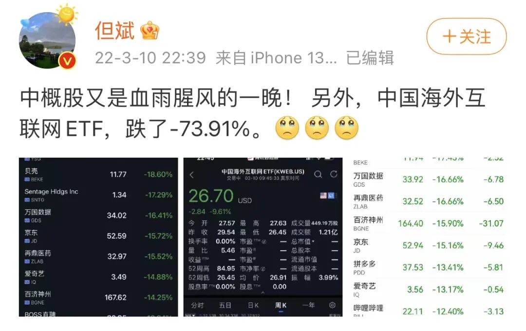 连但斌老师都不“淡定”了,3月10日晚22:39微博上发声:“中概股又是血雨腥风的一晚!另外,中国海外互联网ETF,跌了-73.91%。”