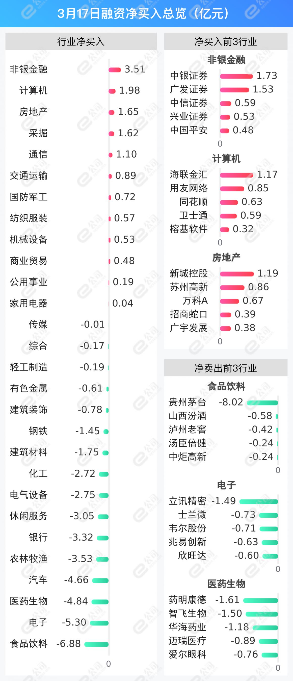 非银金融、计算机、房地产获融资净买入金额居前,分别为3.51亿元、1.98亿元、1.65亿元。