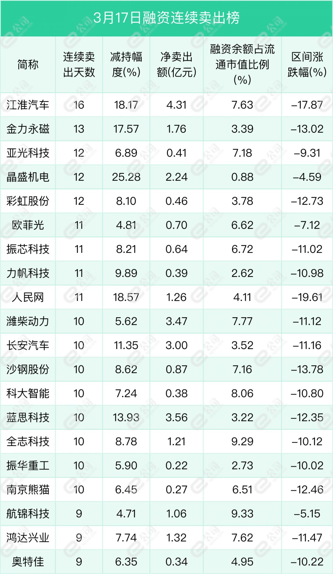 江淮汽车、金力永磁、亚光科技遭融资连续净卖出天数居前,分别为16天、13天、12天,期间净卖出额分别为4.31亿元、1.76亿元、0.41亿元,期间减持幅度分别为18.17%、17.57%、6.89%。